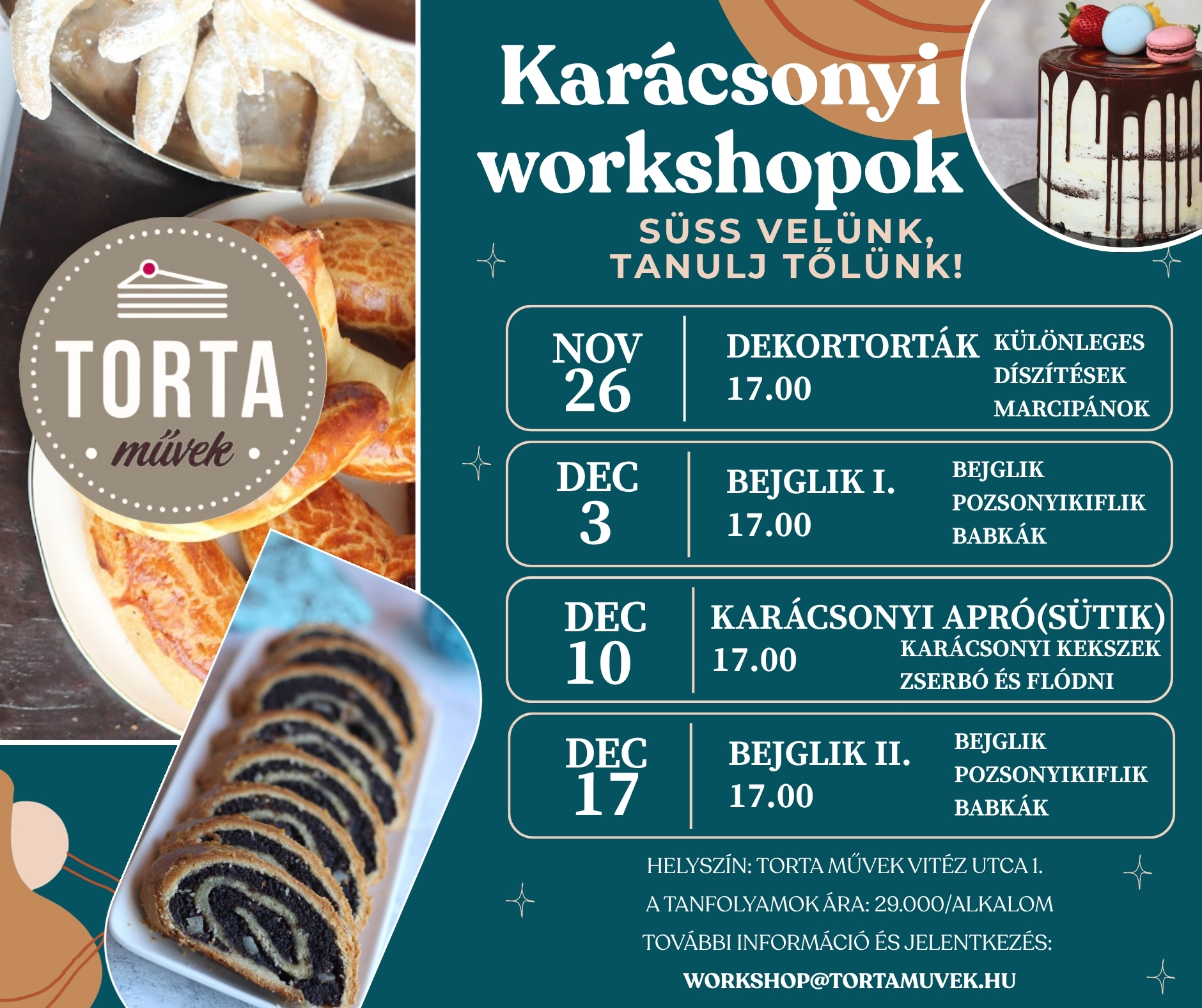 Ahogy közeleg a Karácsony, ismét itt az idő egy kis közös sütögetésre. Idén három különböző tematikájú workshoppal is készültünk nektek. Süssetek velünk, tanuljatok tőlünk újra! Most először új üzletünkben látványkonyhánkban lesheted el a trükköket és próbálhatod ki magad is a bejglisütés, a torta dekorálás vagy az aprósütemény variációk titkait. Jelentekezz minél előbb, a helyek száma korlátozott! Információ: https://tortamuvek.hu/workshopok-a-torta-muvekben/
