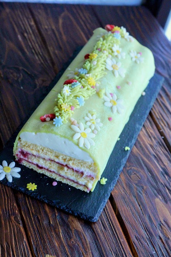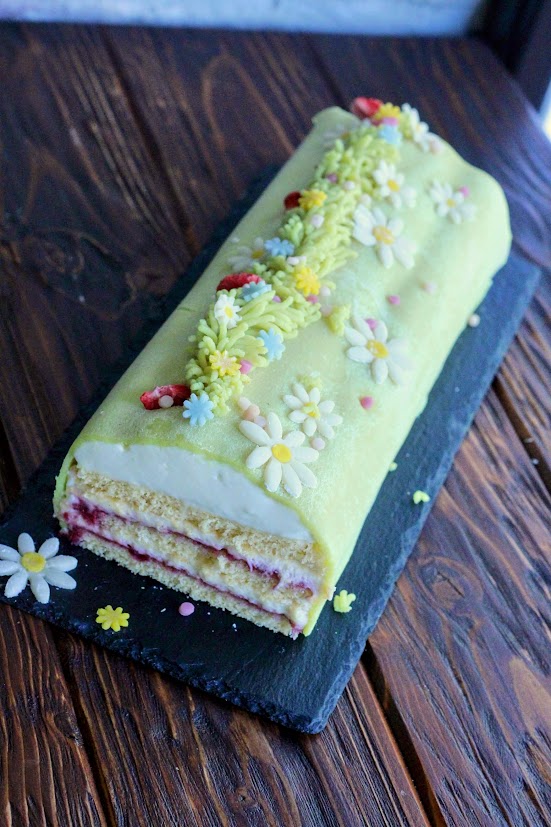 Különleges desszert az ünnepi asztalra. Puha piskótarétegek vaníliakrémmel, málnával rétegezve, mascarponekrémmel és zöld marcipánnal bevonva. Ízléses húsvéti díszítéssel.